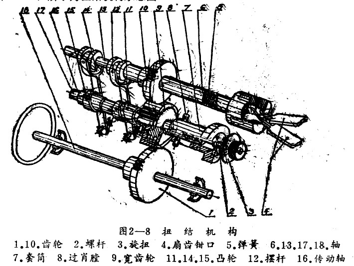 搪塊經裹包后,兩端要扭結封閉。該機構由左右兩部分組成,圖示為左端部分。